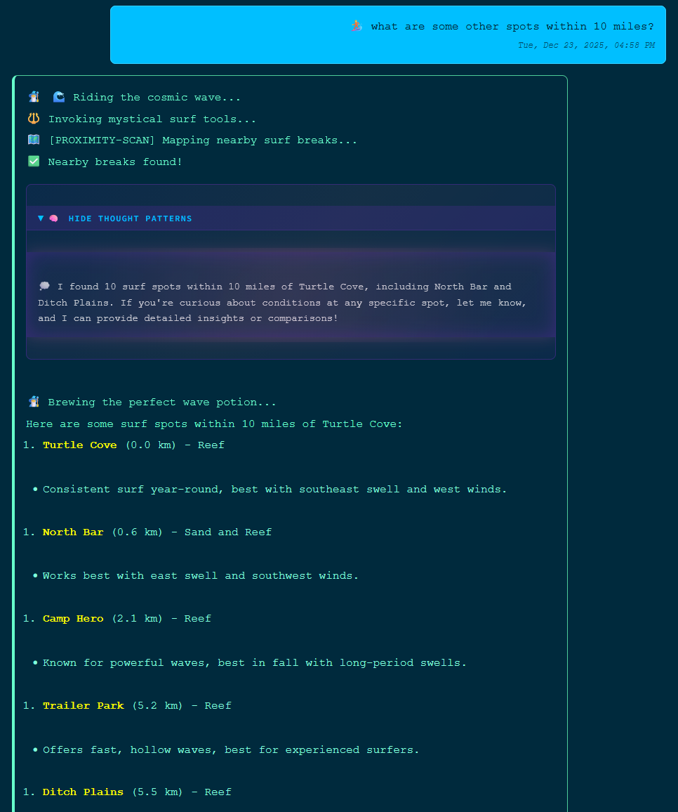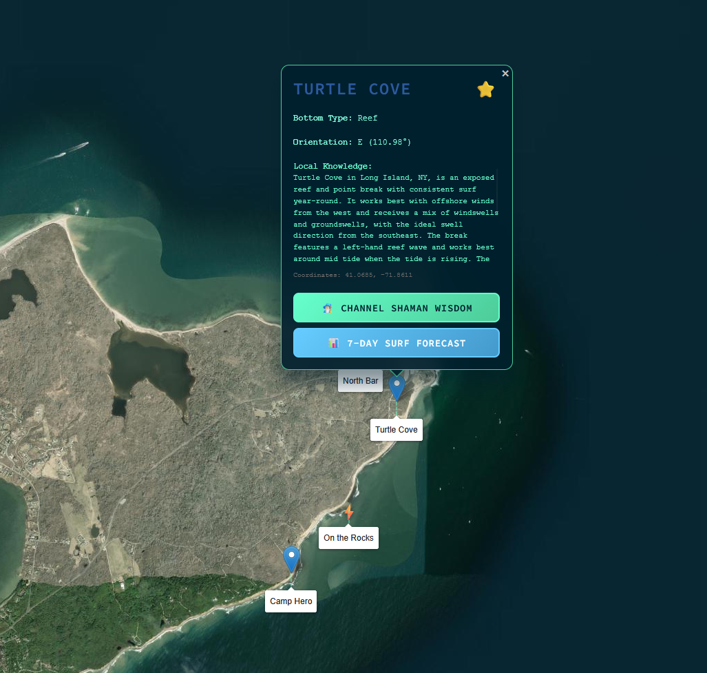 Using Shaman, we search for nearby surf spots within 10 miles of Turtle Cove. The result is a long list — reefs, sandbars, exposed breaks, protected corners — each with different preferences and personalities.